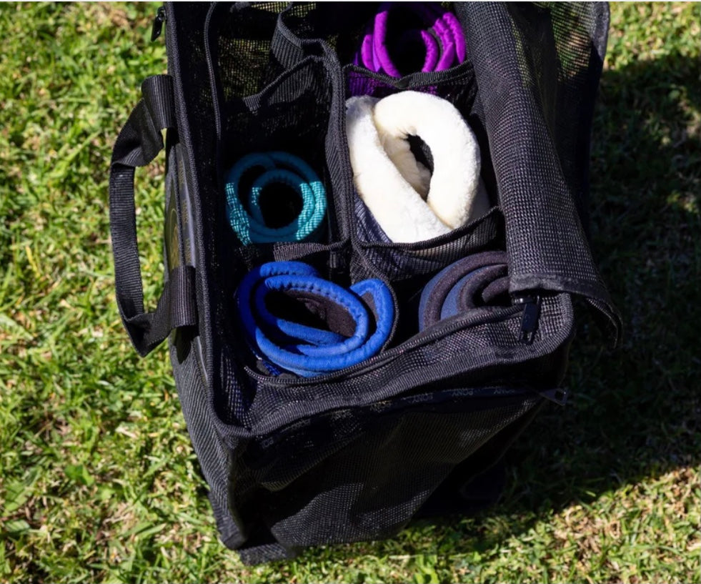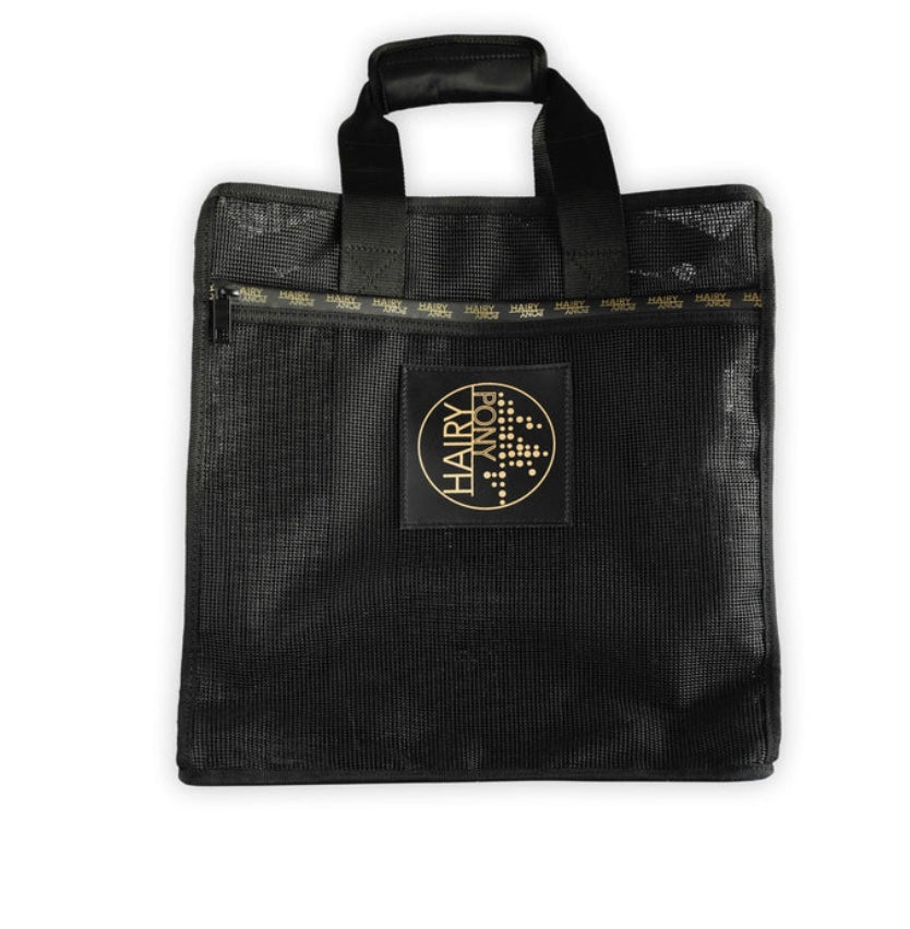 Made with quick drying, waterproof mesh, the HAIRY PONY MESH BOOT BAG is designed to store all your sandy, dirty & wet horse boots. The durable mesh material allows sand & dirt to fall through the bottom of the bag, allowing you to shake or hose off boots neatly in the bag, before hanging out to dry. The HAIRY PONY MESH BOOT BAG has plenty of room with six internal divided spaces for your horse’s boots, as well as a gold snap ring to hold accessories.