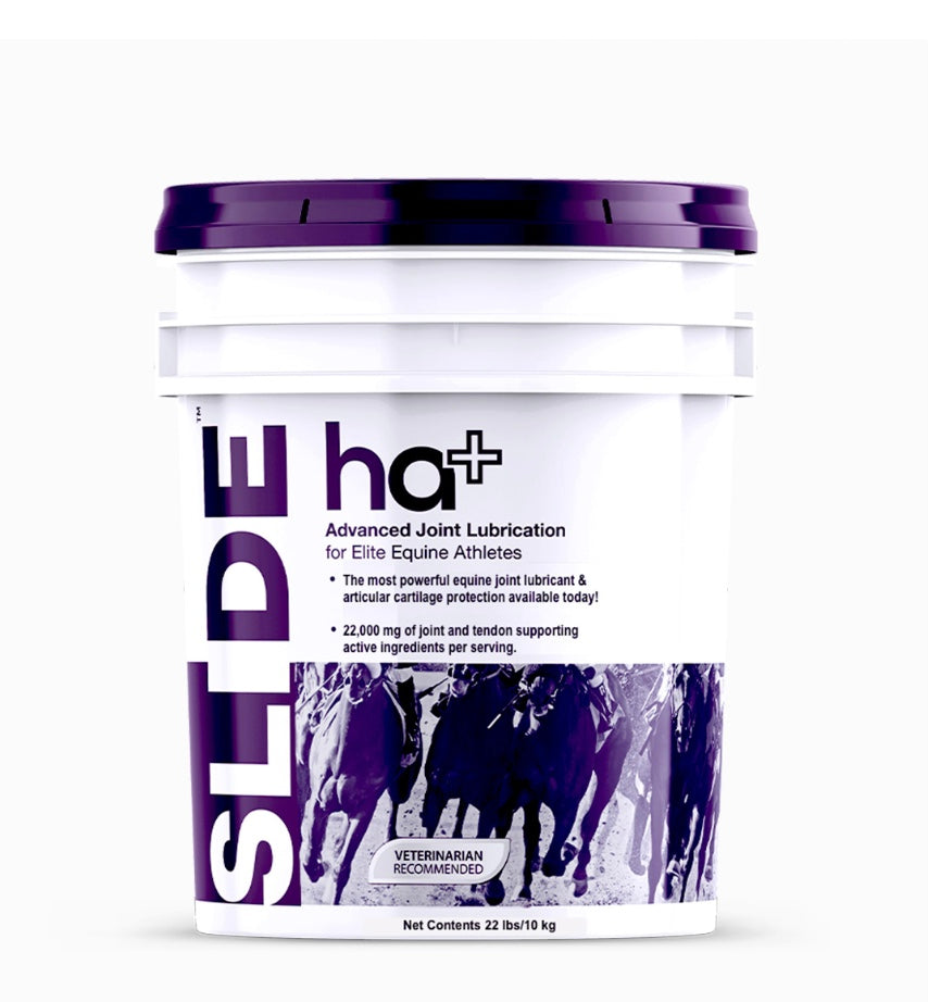 SLIDE™ ha+ Equine delivers a powerful daily dose of 5,000 mg of high molecular weight hyaluronic acid — plus additional joint-supporting compounds — to help maintain optimal joint lubrication, protect cartilage, and support long-term soundness. It’s serious joint care for serious equine athletes.